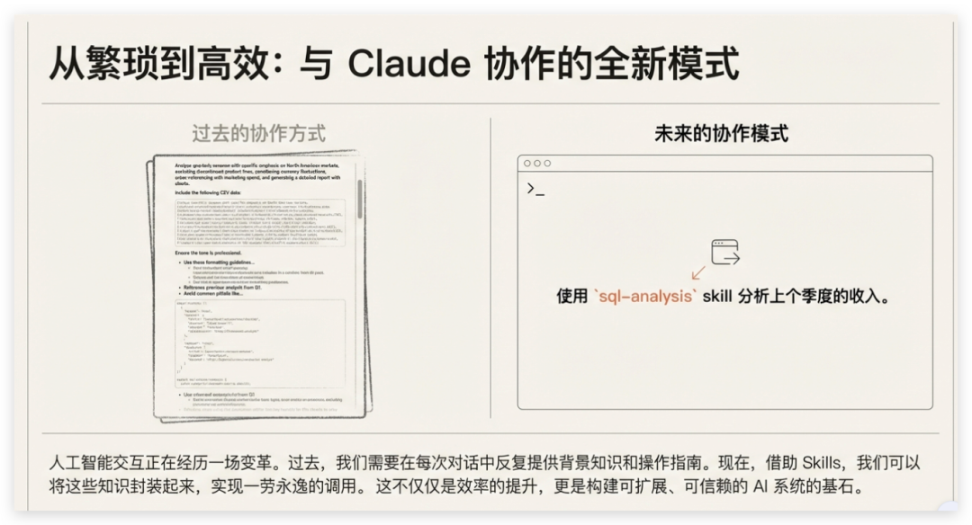 Skills 改变了我们与 AI 协作的基本方式。它们将一次性的提示,转变为持久、可组合的知识资产。