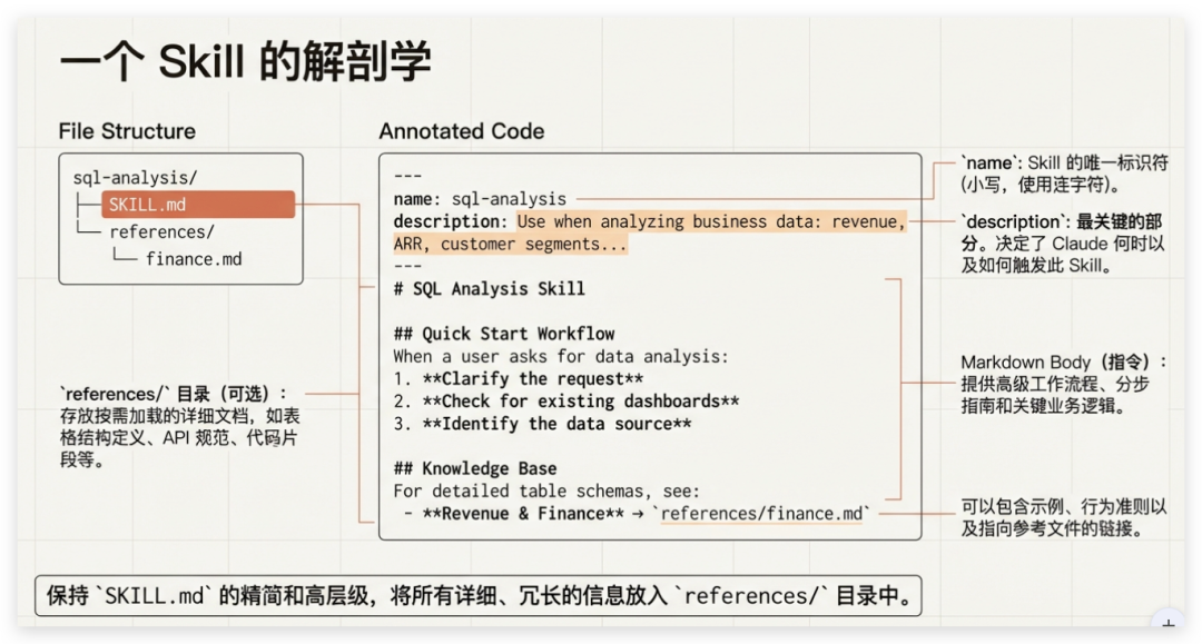 从使用层面上理解 Skills 是包含指令、脚本和资源的文件夹,供 LLM 可以动态加载,底层采用的是渐进式披露,也就是仅在需要的时候加载技能的详细指令,能有效节省宝贵的上下文窗口。