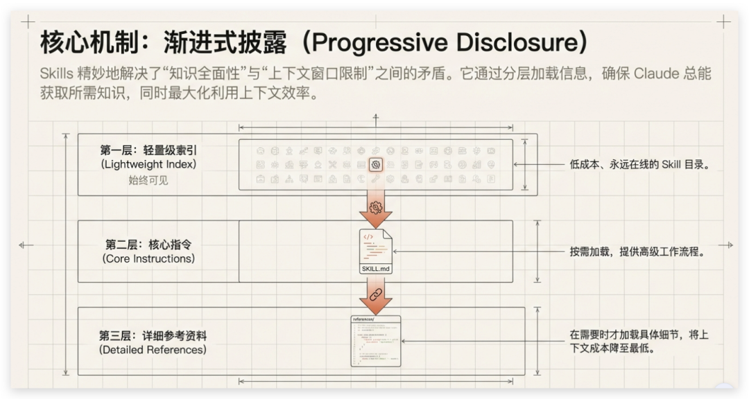 那 Skills 的核心机制是通过渐进式披露 (Progressive Disclosure),通过分层加载信息,确保 AI 总能获取所需知识,同时最大化利用上下文的效率。