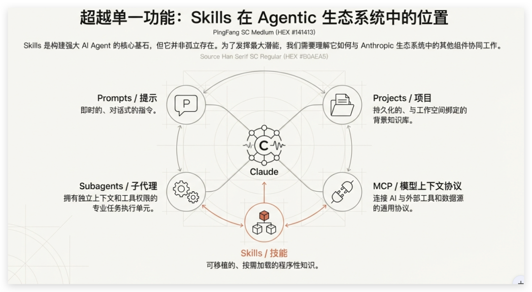 Skills 是构建强大 Al Agent 的核心基石,但它并非孤立存在。为了发挥最大潜能,我们需要理解它如何与 Anthropic 生态系统中的其他组件协同工作。