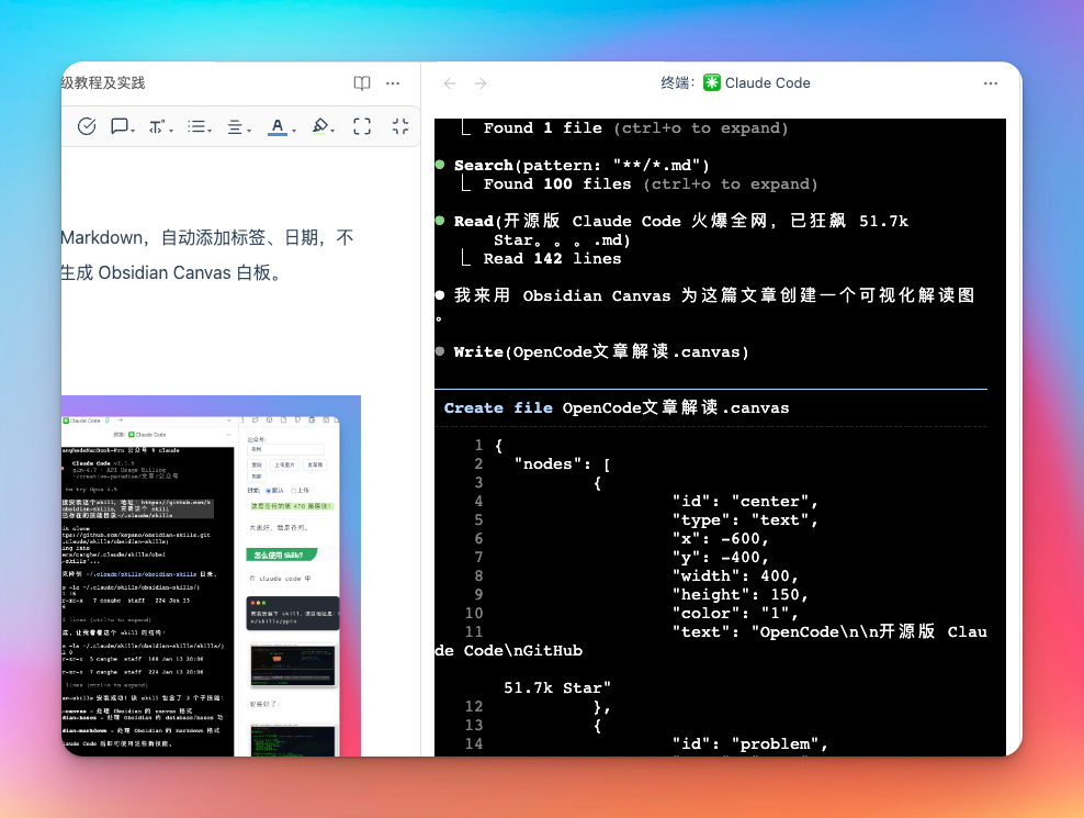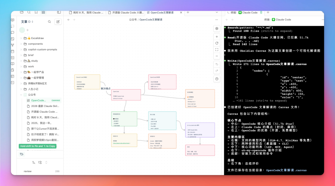 然后输入提示词:用obsidian-skills画一个 canvas 来解读这一篇文章”开源版 Claude Code 火爆全网,已狂飙 51.7k Star。。。”