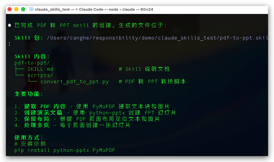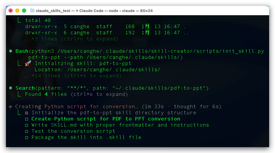 接下来就什么都不用管了,很快就生成好了这个 skill: