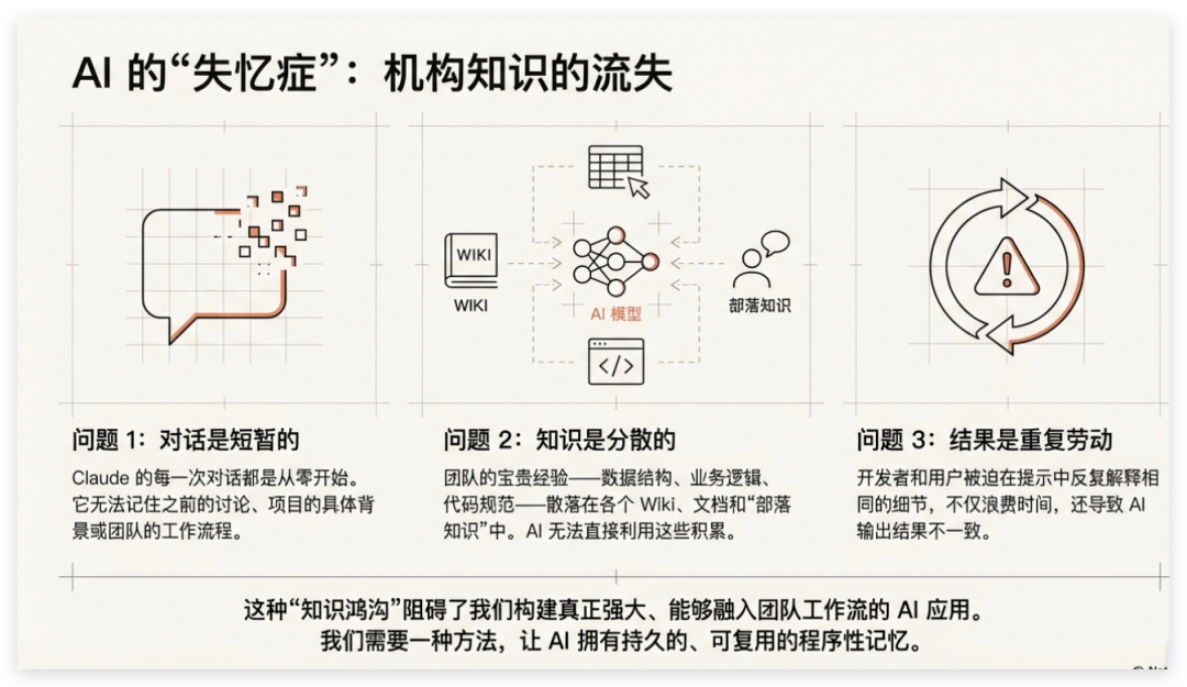 2、知识是分散的:团队经验(数据结构、业务逻辑等)分散在 Wiki、文档里,AI 无法直接调用