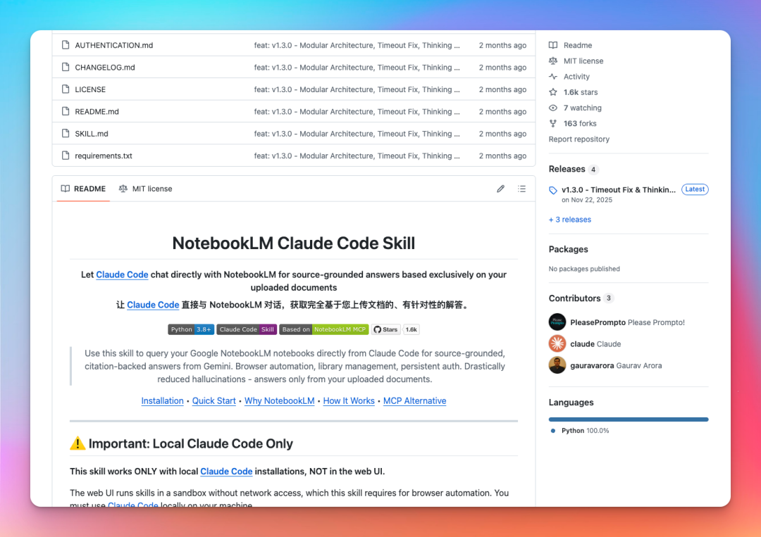 地址:https://github.com/PleasePrompto/notebooklm-skill