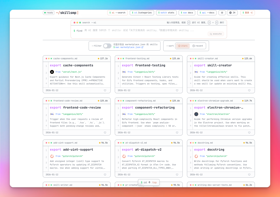 然后可以在这里用 AI 来搜索你想要的 Skills,也可以按照分类查找。