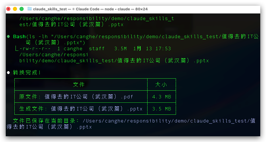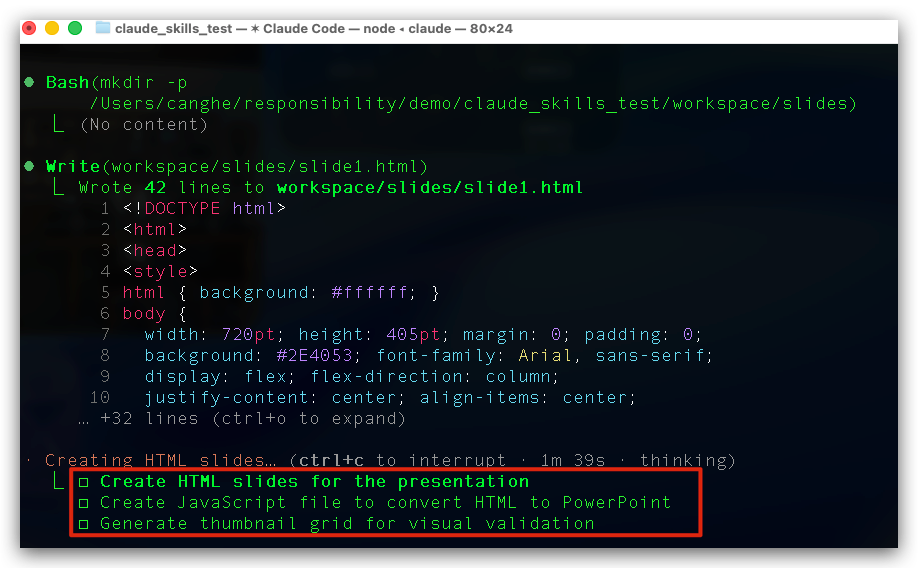 可以看到先是去用 HTML 来写 PPT,然后调用 pptx skill 里面的 html2pptx.md 约束,把 html 转为 PPT。